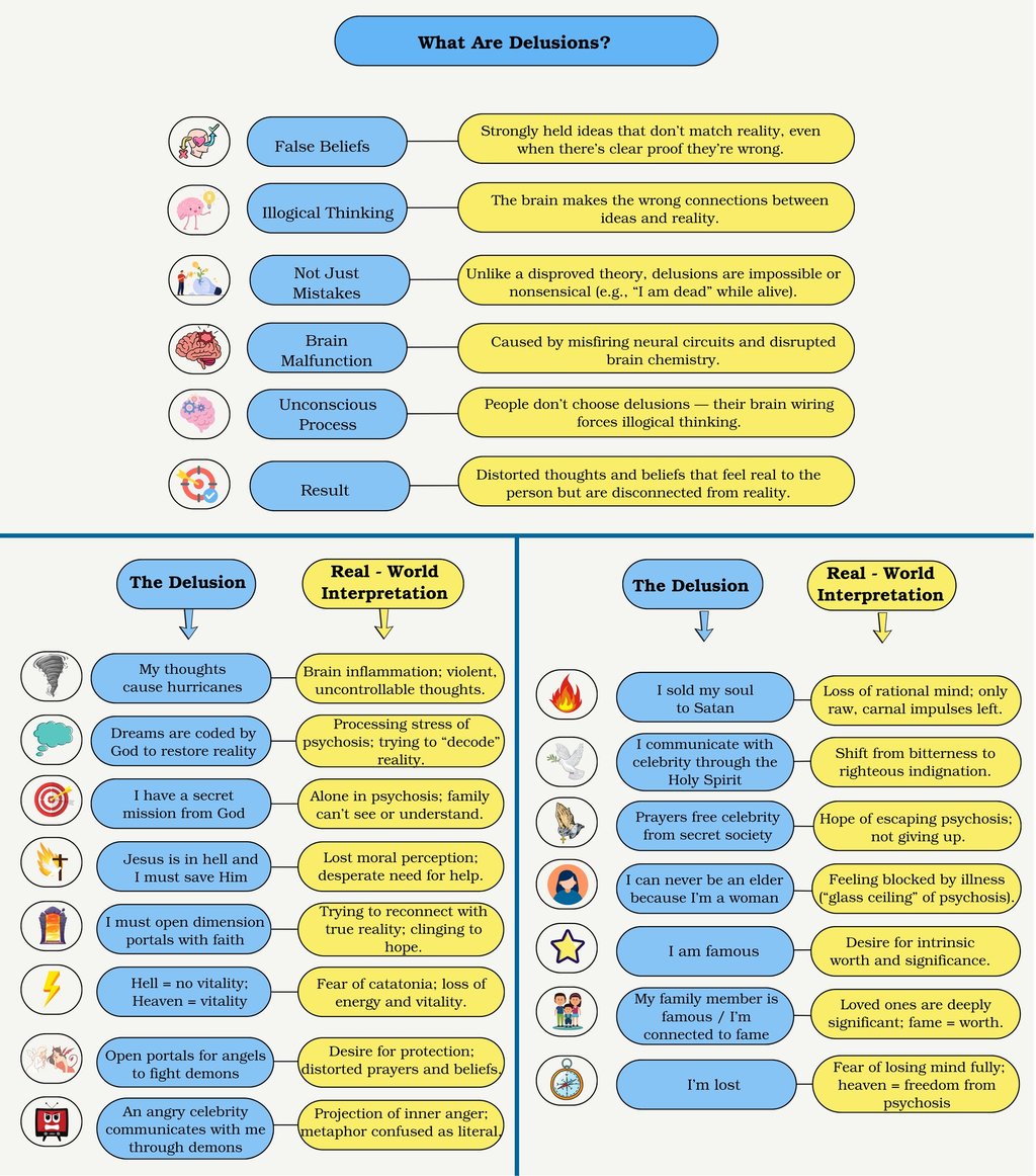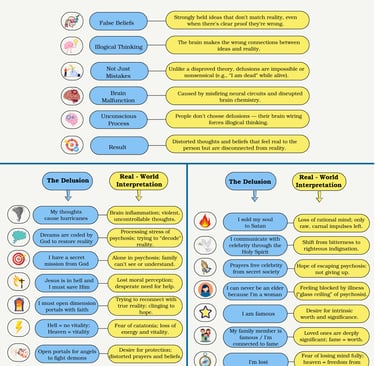 I put together a chart that shows some of my delusions I had during psychosis, and the real world situation I believe my brain was trying to reference and think about, but couldn't because it had faulty neural connections while psychotic.